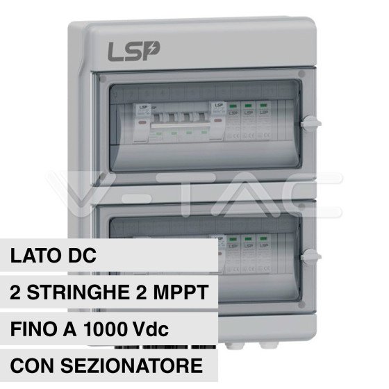 Quadro elettrico DC a 2 stringhe e 2 MPPT per impianti fotovoltaici. Dotato di scaricatore di sovratensione e sezionatore, ...