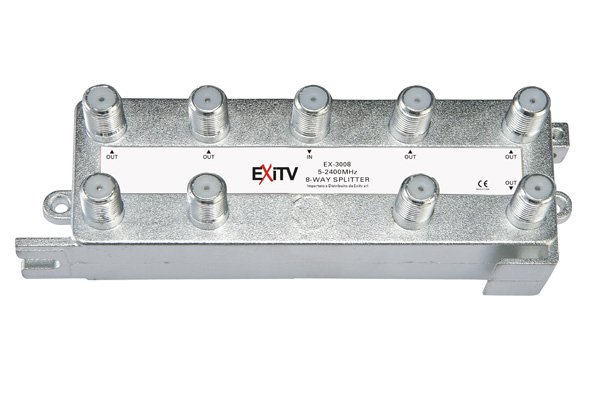 Divisore ad 1 ingresso e 8 uscite per segnali TV e Satellite con connettore F e corpo in pressofusione schermato.